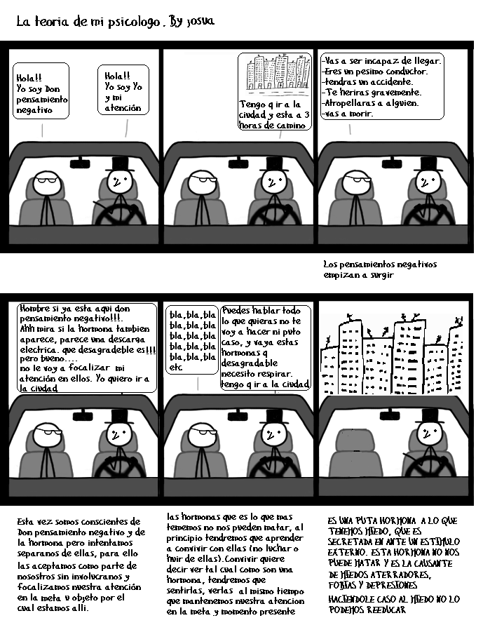 Sip, hay una cosa que a la larga ayuda mucho y que yo llamo vigilancia mental del que esta tira es un buen ejemplo. Todo pensamiento consciente lo es en forma verbal. Aun sin darte cuenta, eliges el pensamiento y la forma de expresarlo, pero si estás atento y lo cambias rápidamente (siempre lo hago mal > la próxima vez será) va quedando poso y poco a poco te acostumbras a pensar mejor (=más útil). Sólo pensando no se consigue nada, eso una mamarrachada, pero al menos no nos boicoteamos. Y al no boicotearmos intentamos más cosas y con más posibilidades de éxito, conseguimos más cosas y eso es La Clave de la vida.